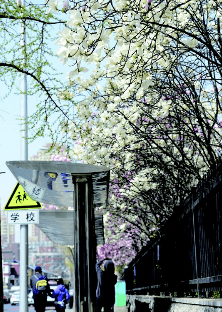 花枝从小学院墙探出,欲将车站覆盖,花香蔓延开来。校园墙外等待学生的家长、过往行人举手就是一张"最美玉兰"。清晨和下午至夕阳西下前,是拍照打卡的最佳时间。
