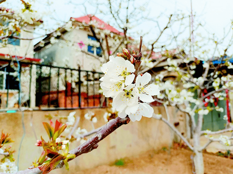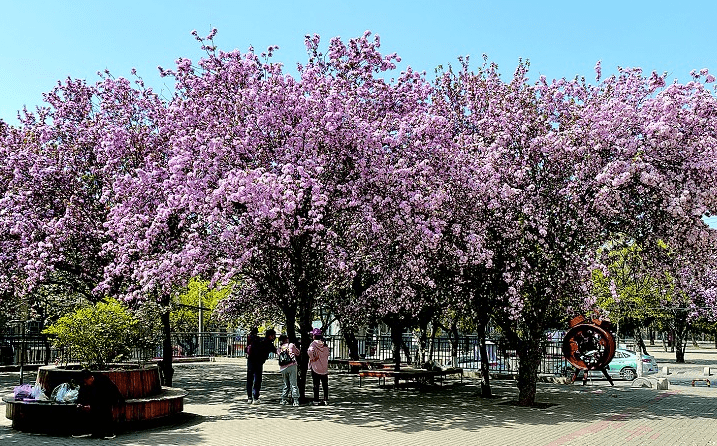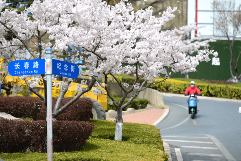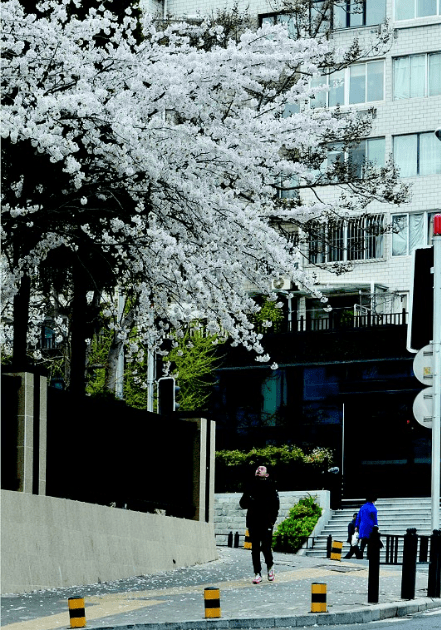 从植物园向迎宾路、棒棰岛景区方向,行至山峦街、怡和街交叉口,向右一步便会带给你转角遇见的惊喜。山峦街 25 号楼旁的两株樱花盛放,伸出围栏的垂枝绝美,樱花与围栏构成独特的生活美学。