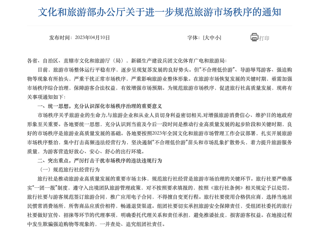 4月10日,国家文化和旅游部办公厅发布《关于进一步规范旅游市场秩序的通知》,提出要严厉打击干扰市场秩序的违法违规行为,规范旅行社行为,旅行社要与游客规范签订旅游合同,推广应用电子合同,对文旅企业的合同管理工作提出了新的要求。