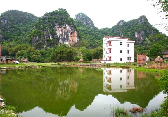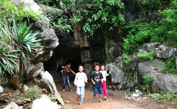 记者从国道入口下车,一段笔直的水泥路在脚下延伸,再向右转即直达村口,沿路两旁是广袤的田畴和果树,右边屹立的石山奇峰,就像大小不一的迎宾石。洞口(即村口)左右两边,是高耸的山峰,入口右侧是村名的标志石和名人题刻。穿过石洞,豁然开朗,平旷开阔,楼房林立。有稻田、山泉、池塘、草木之属。是一幅天人互泰、鸟语花香、鸡犬相闻的美好图景。