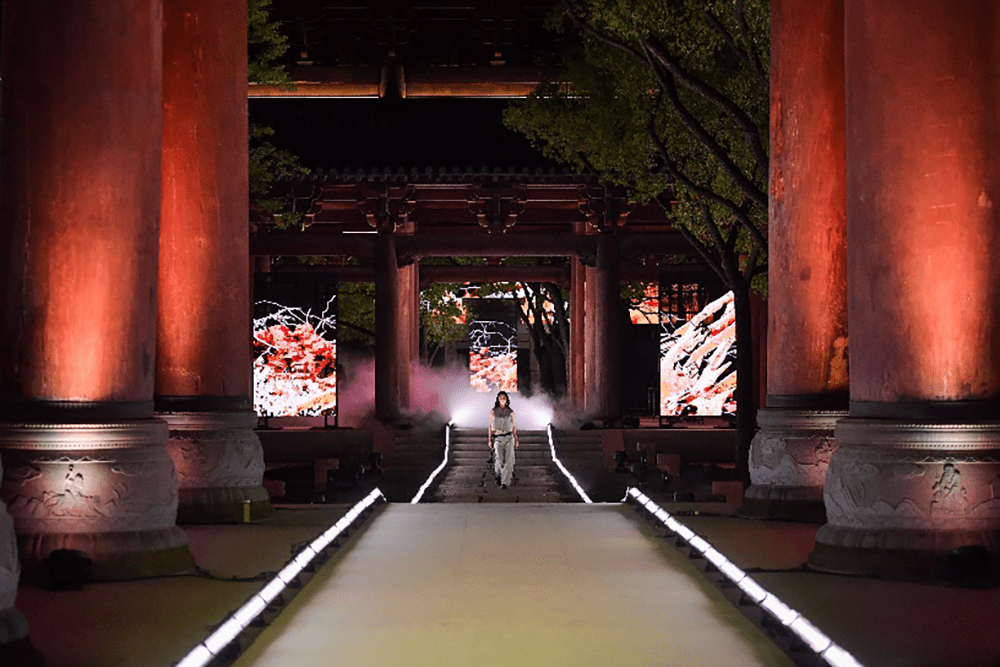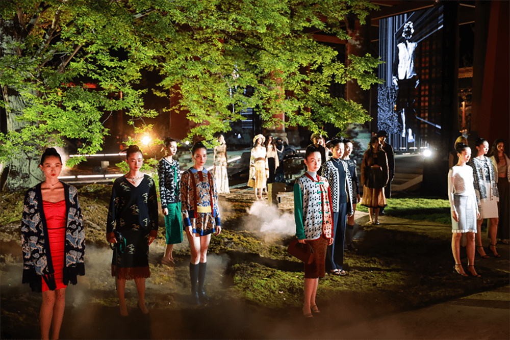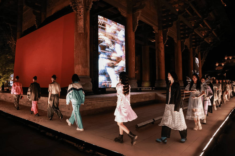 地标建筑水上禅堂里,十余场时装秀每日上演,开幕大秀更是全球首位登上巴黎时装周官方日程的最年轻中国设计师MASHAMA。修缮一新的福善寺面积广阔,一场新生数字秀在唐宋雕栏建筑与苍劲错节的高耸古树间上演,时尚、电子音乐、现代舞、虚拟模特与新媒体装置,千年古镇和未来时尚在这里展开一场对话。