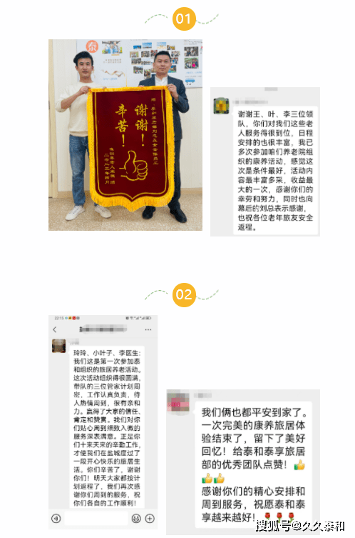 千岛湖和江苏盐城的旅行顺利返京,泰享游旅居受到了长者和家属的一致好评。旅行虽然结束,但旅途中的风景和互助、互相陪伴的快乐却留在心底,长者和家属纷纷发来对旅居项目的感受和问候,期待着下一次旅行的再出发。