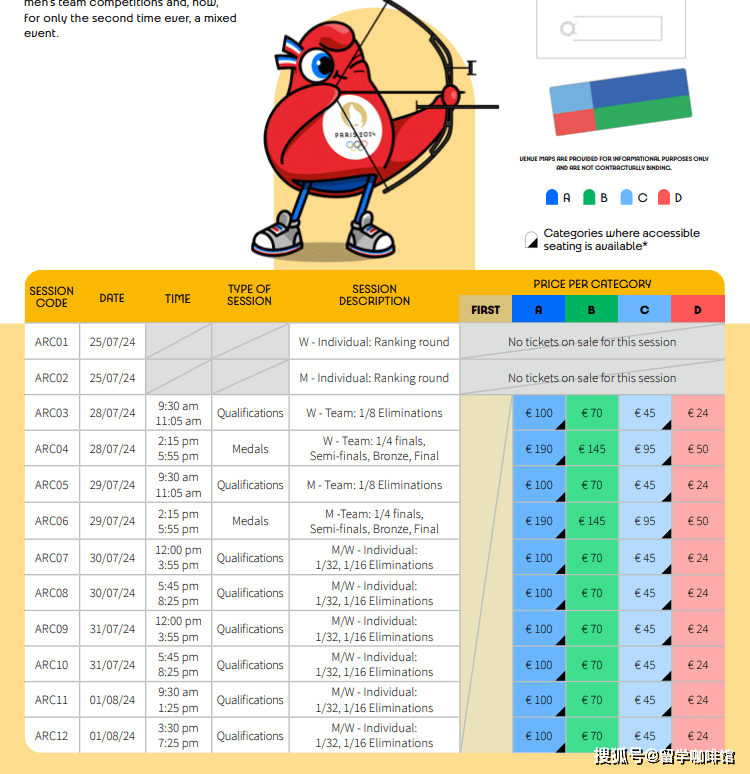 比如射箭项目,它的门票价格区间从 24 -190 欧元不等。场馆一共分为 A、B、C、D 四个区域,价格也是依照该等级从高到低。其中资格赛的价格比决赛的价格便宜了一半左右。