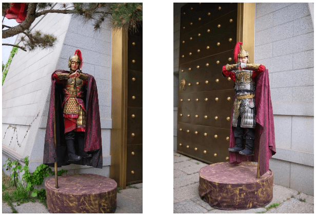 入口的长安门看着十分霸气,城门口站着两个守卫的士兵,装扮成浮空魔术的样子,难道是唐朝的杂耍把戏?