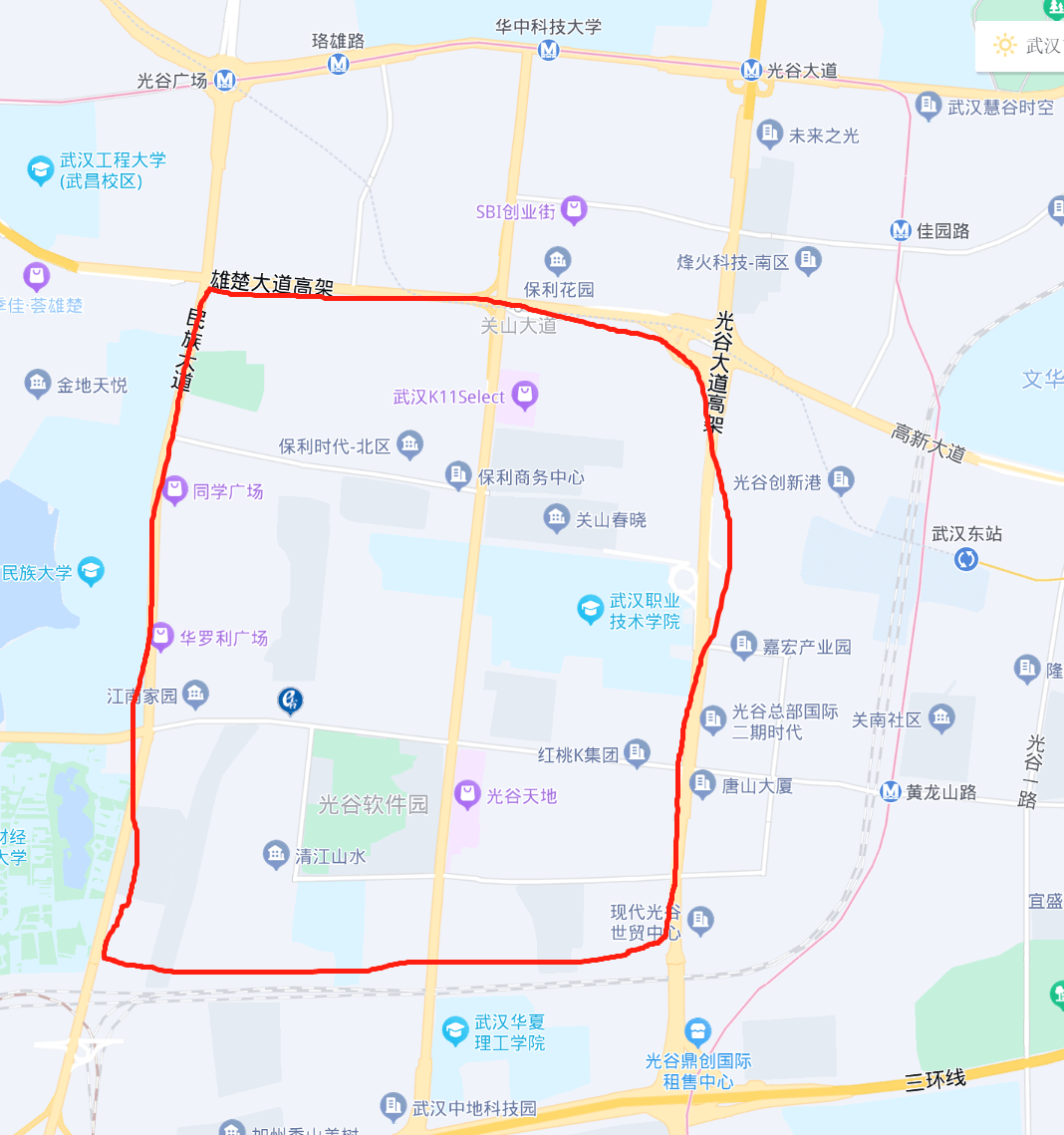 光谷民族大道和关山大道片区(图中圈出来的部分)是武汉三环内最缺地铁的地方,每次网友总说光谷缺地铁,说的就是光谷这个地方。