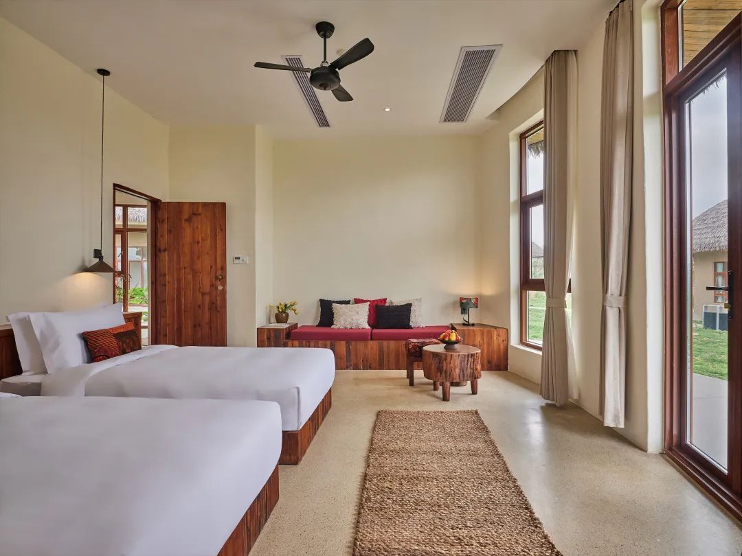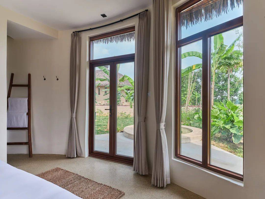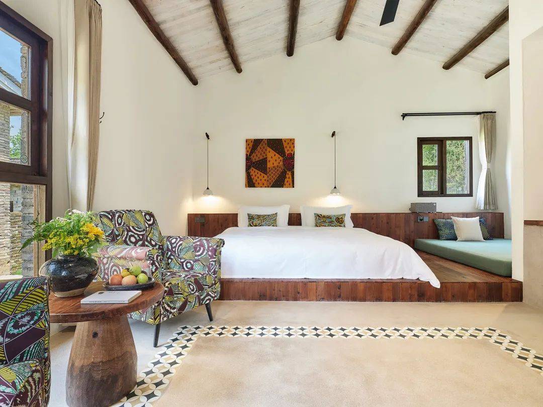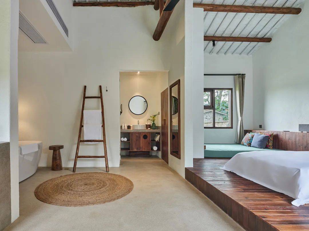 十间客房,在保留西坡风格DNA的同时,也增添了中越边境民俗文化风貌的野趣。窗外是茂盛的蕉林绿树,早晨醒来时,阳光浸染着纱帘,植被摇曳,整个人便也闲散松弛了下来。