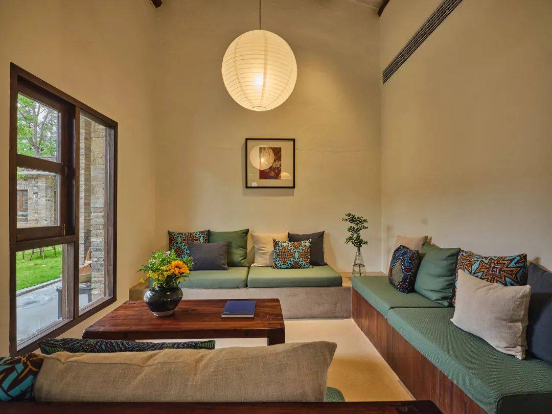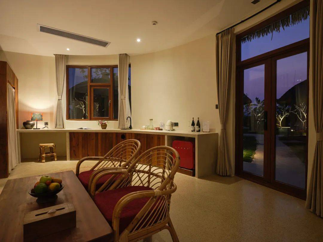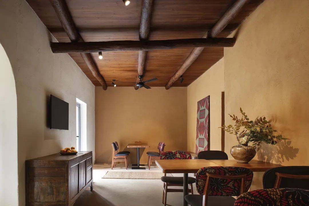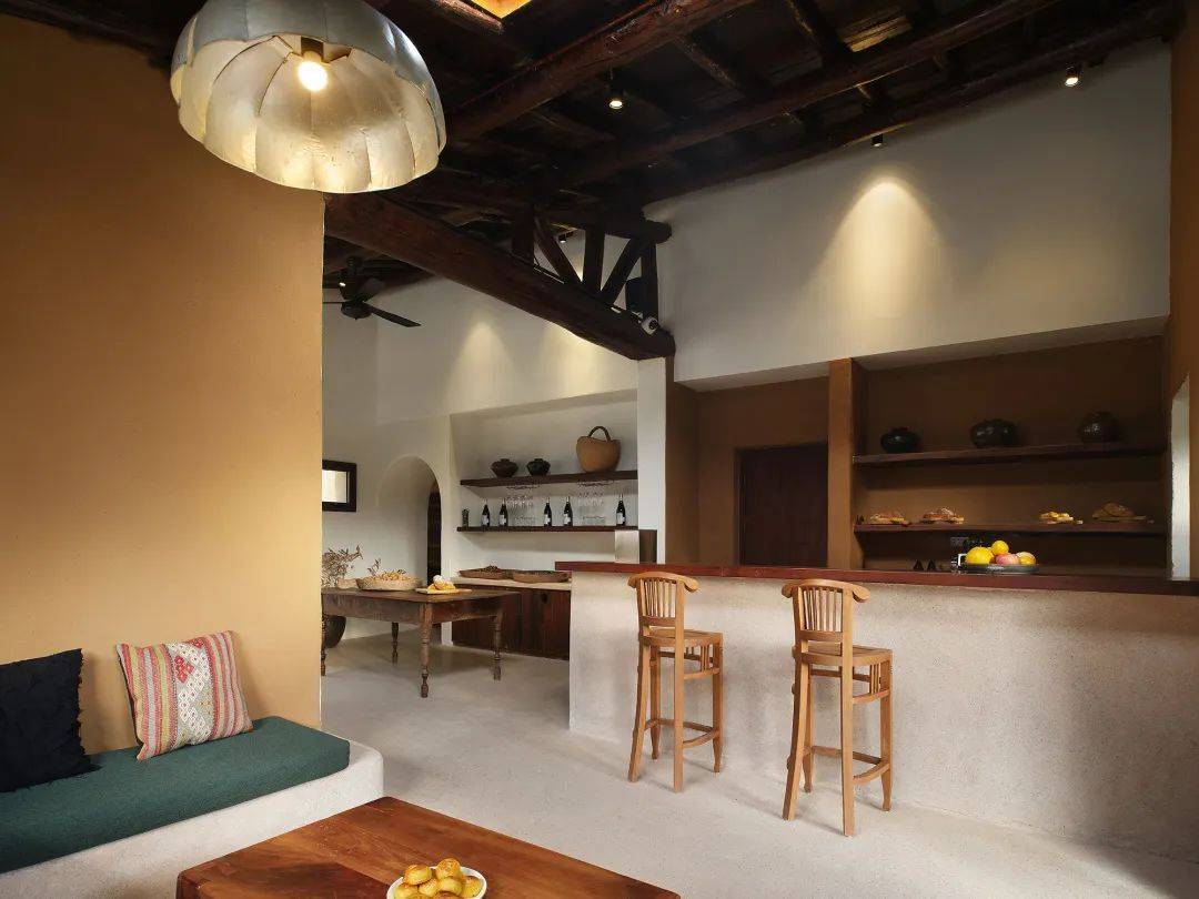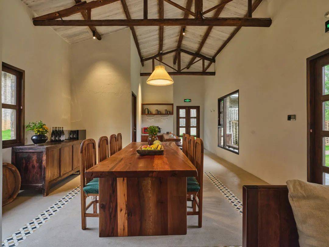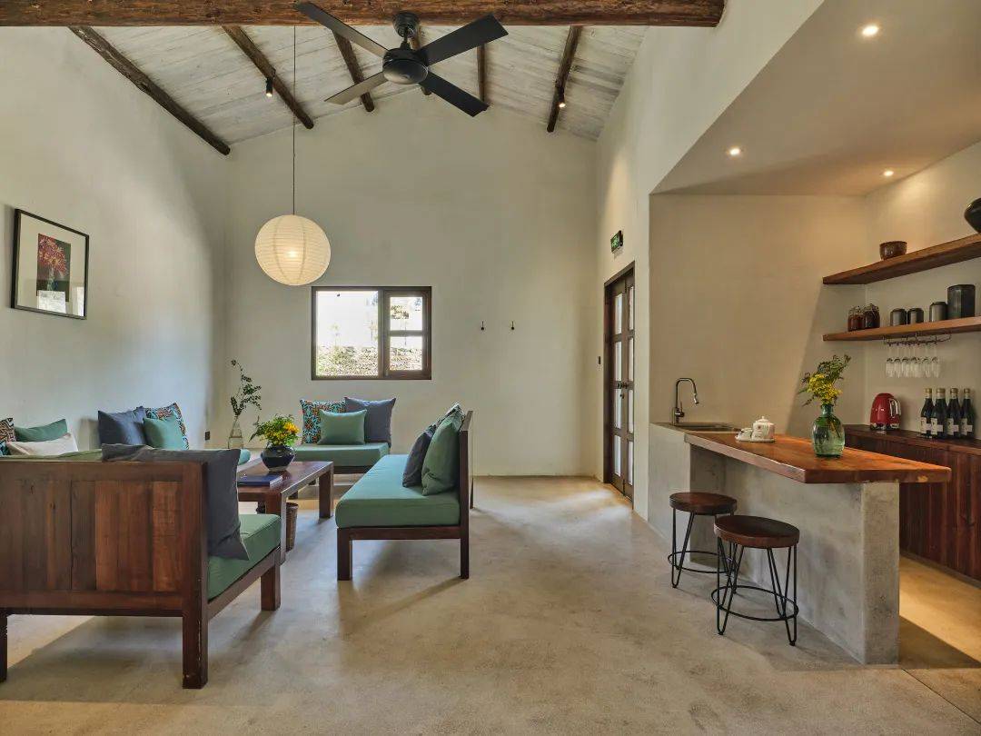院落里有着宽敞的客厅,客厅内配有厨房、用餐区、吧台。也许从此刻开始,你便可以开始幻想着,坐在小院的果树下,听着虫鸣蛙叫,闻着厨房的饭菜飘香,惬意地享受着古早生活的田园时光。