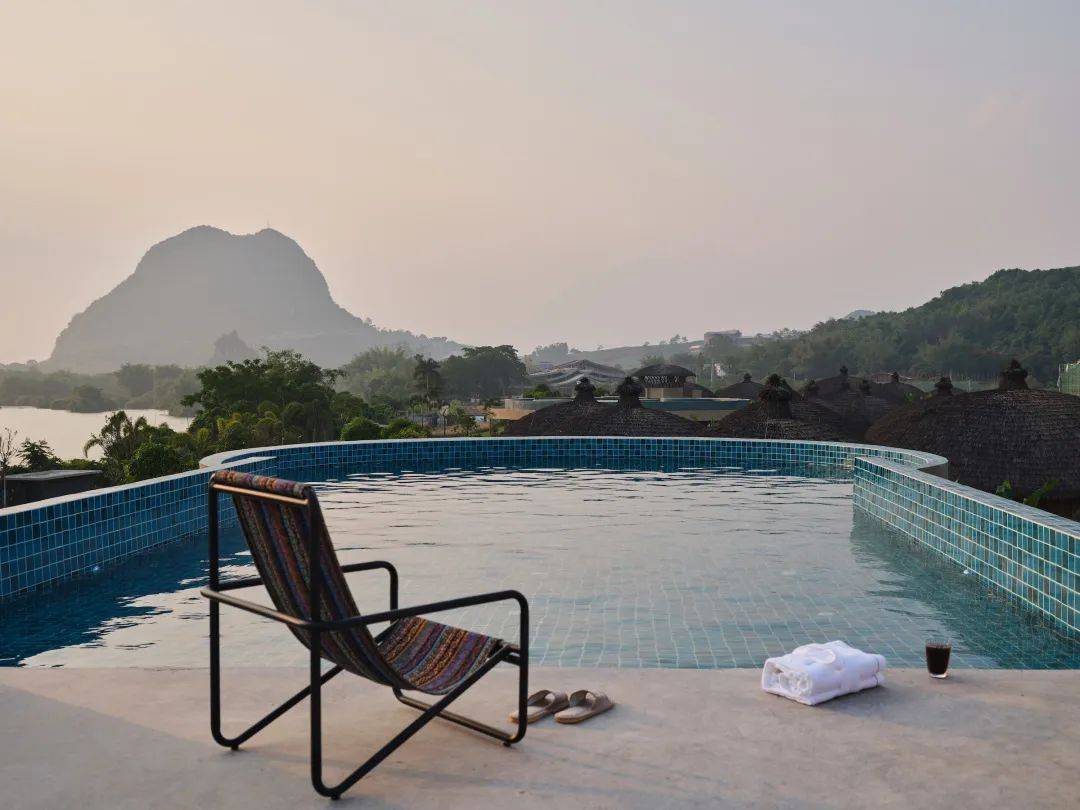接待大厅的顶楼天台,是西坡崇左店的惊喜所在。无边泳池的背景,是崇左的山水画卷。这里的清晨、落日、与星空,在缓缓与长居于城市的你诉说着,如何与自然对话和共鸣。