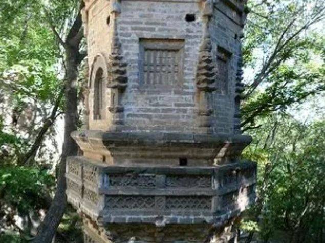 前後有假门,其它四面为十八格假窗。一层六转角各嵌一五层小塔。塔座嵌动物花卉浮雕十一块,浮雕上有雕花护栏。塔顶上长一颗松树,饶有奇趣。
