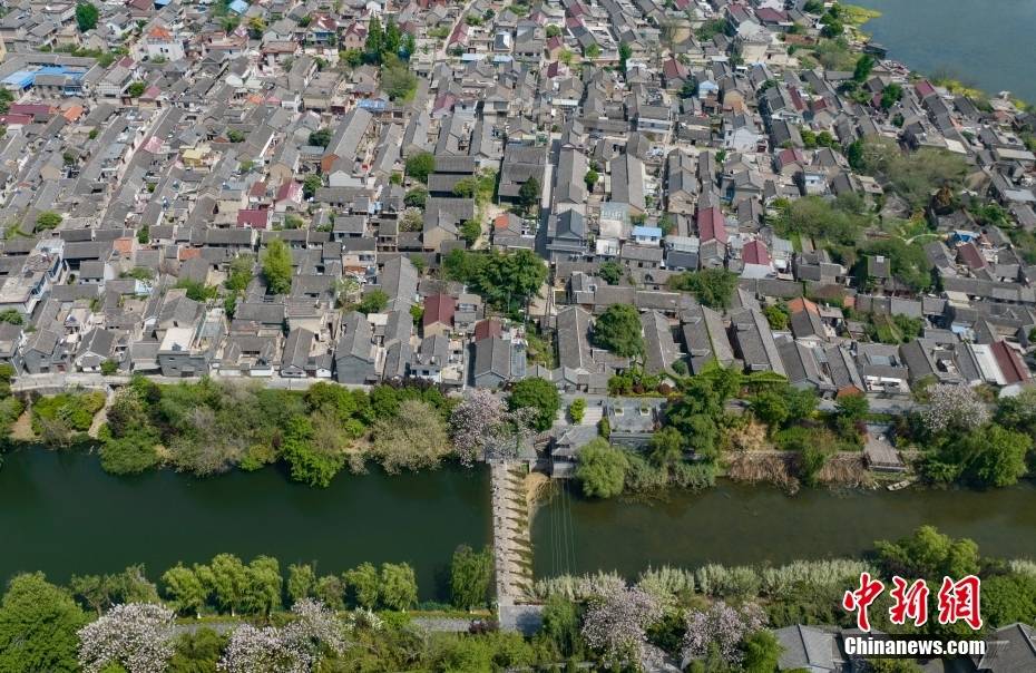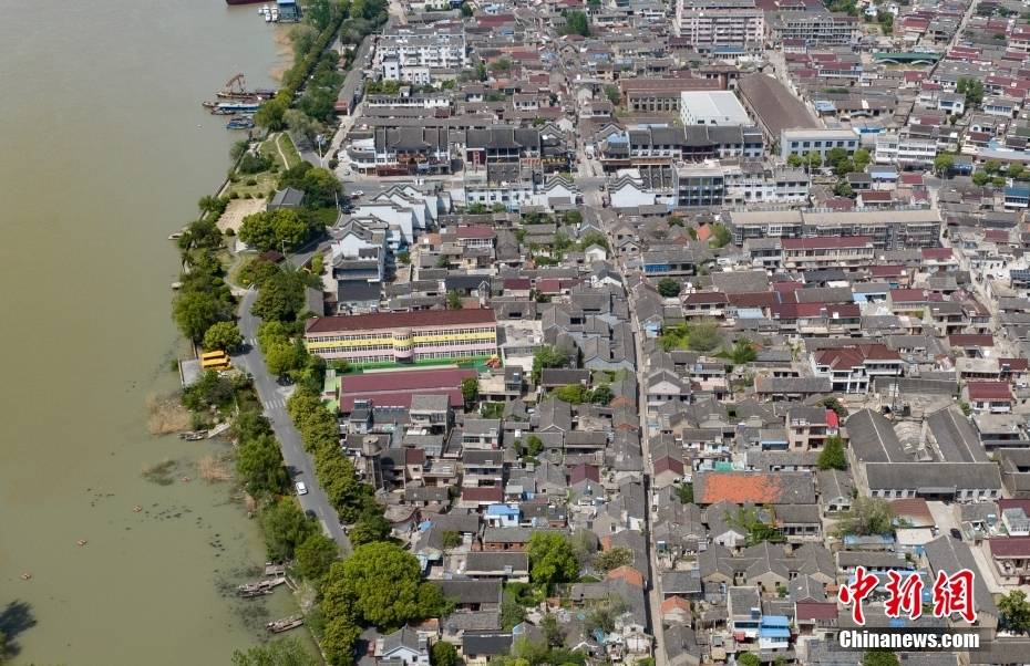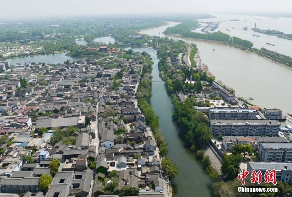 4月17日,江苏省扬州市,航拍京杭大运河畔的邵伯古镇。至今已有1600多年历史的邵伯古镇南濒长江、西邻邵伯湖、中贯京杭大运河,“南船北马水陆联运”的交通枢纽地位使邵伯在历史上一度成为流金淌银的商贸重镇。(无人机照片)