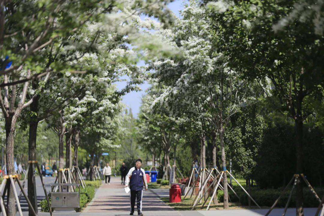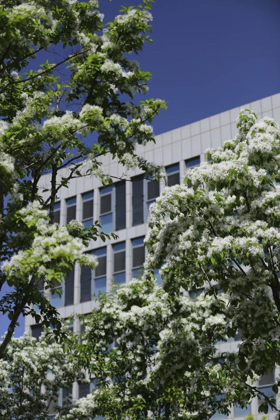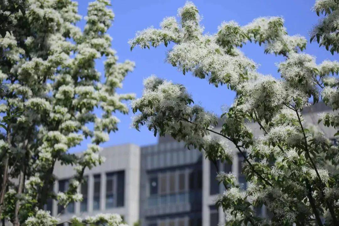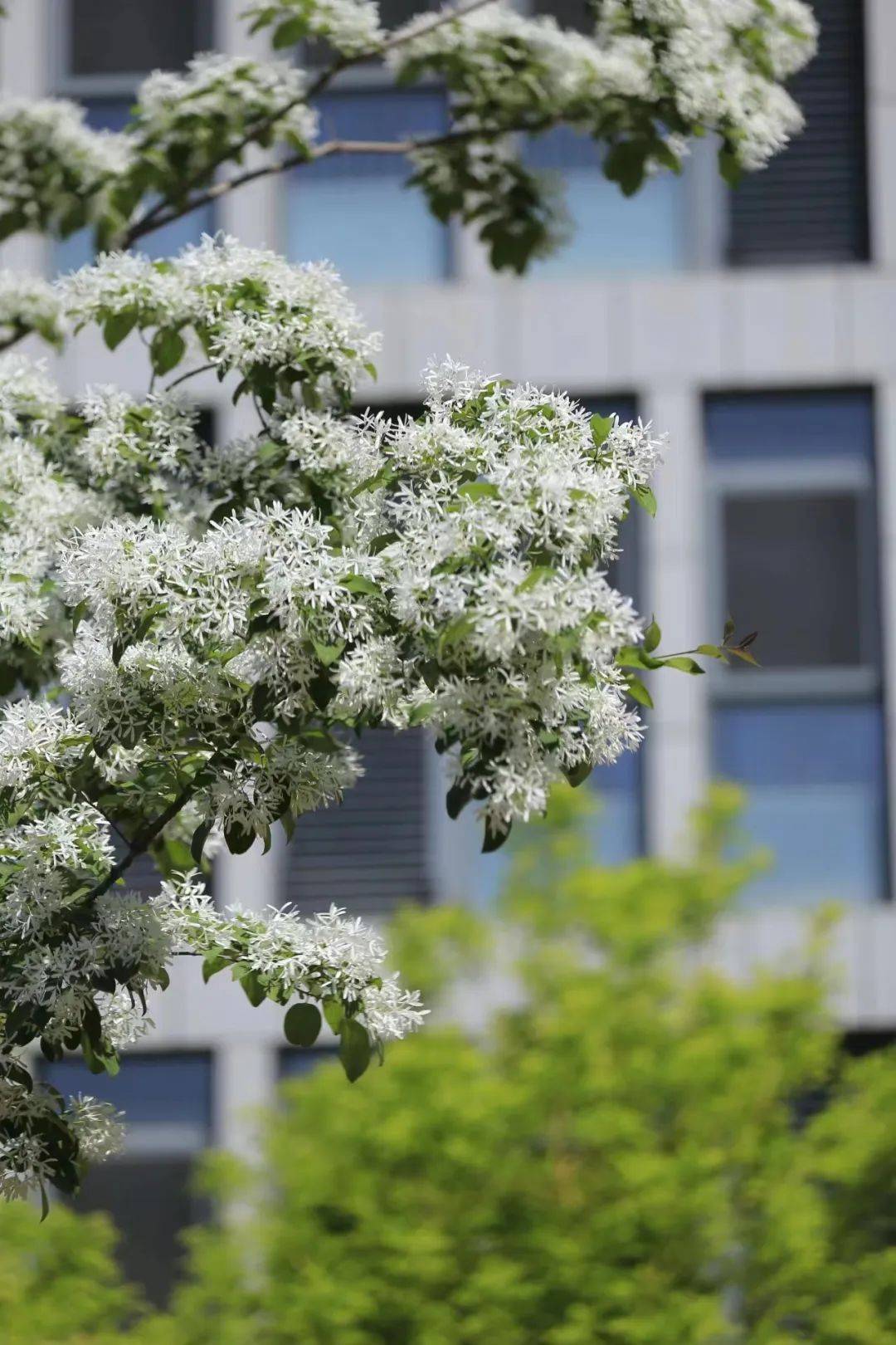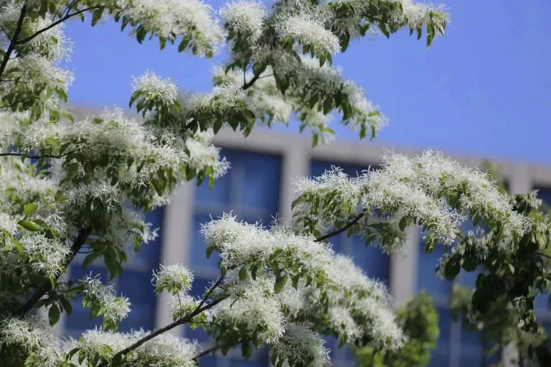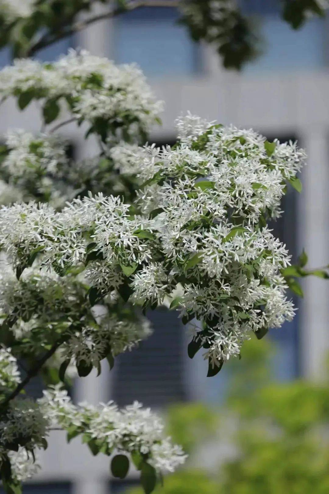 山东农业工程学院淄博校区内洁白的流苏花开满树冠,从远处望去,流苏树伞型的树冠如披白雪。纤长的花瓣,微风吹来,随风摇曳,煞是好看。站在树下,阵阵花香,芳香四溢,清新怡人。