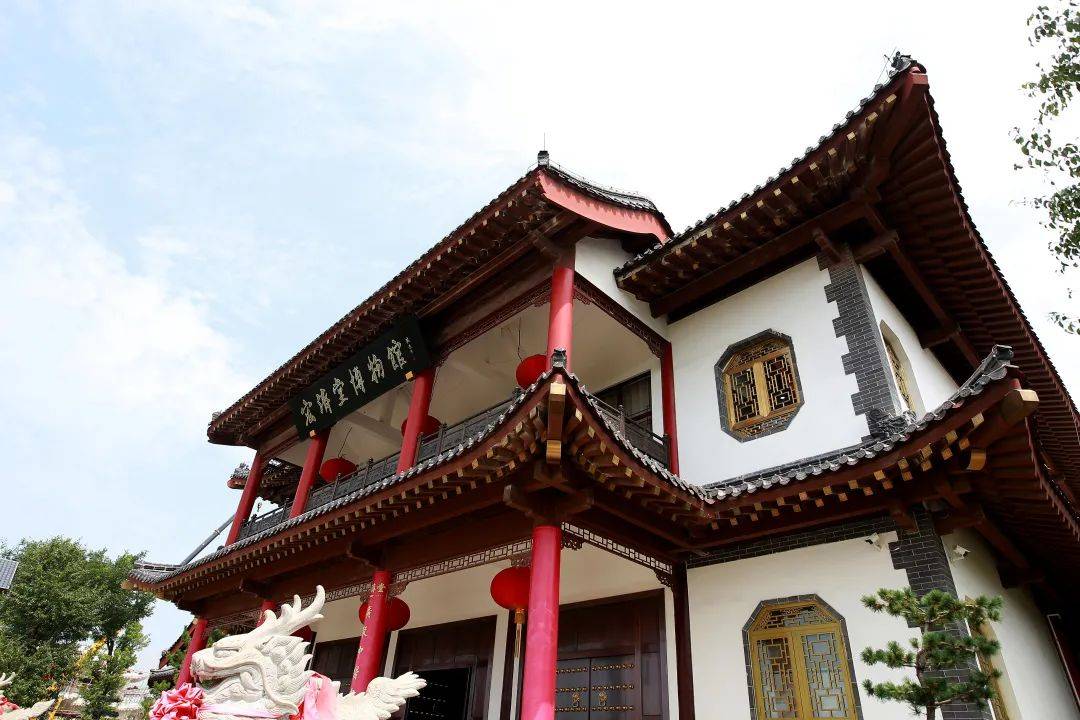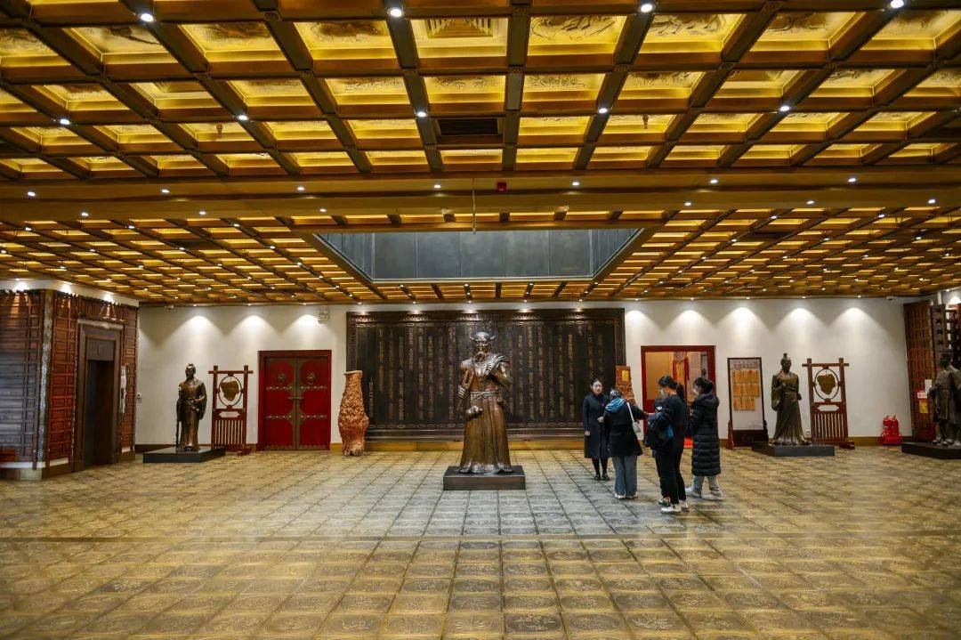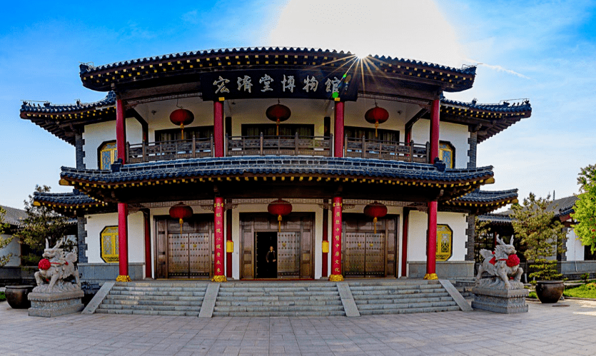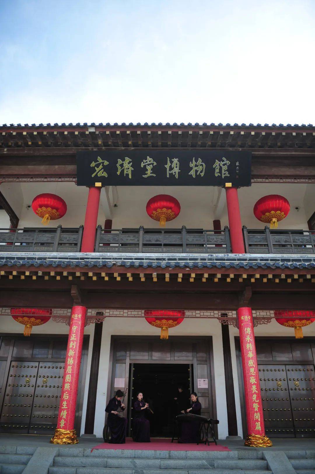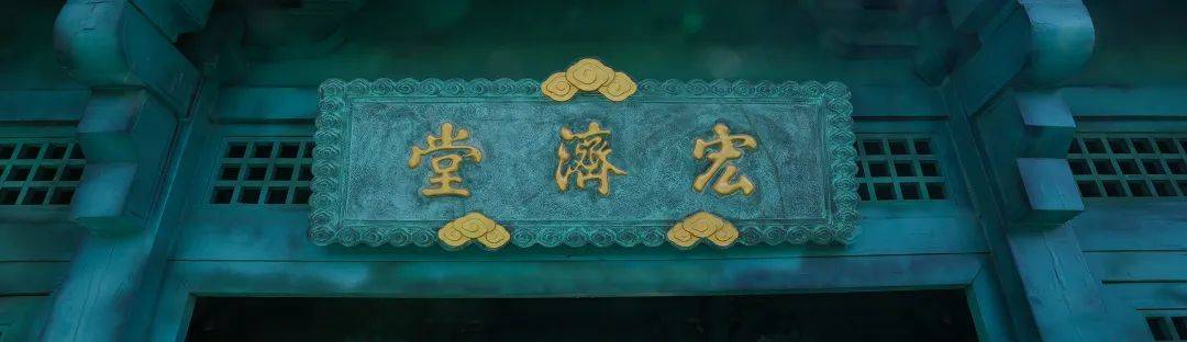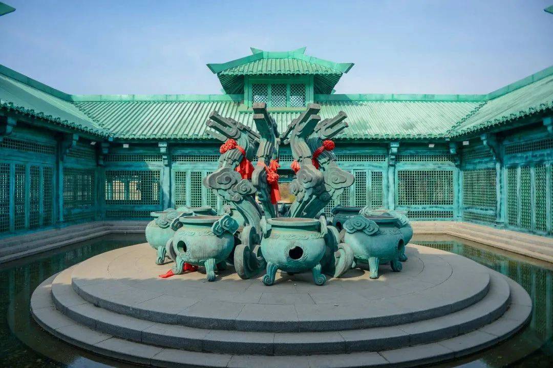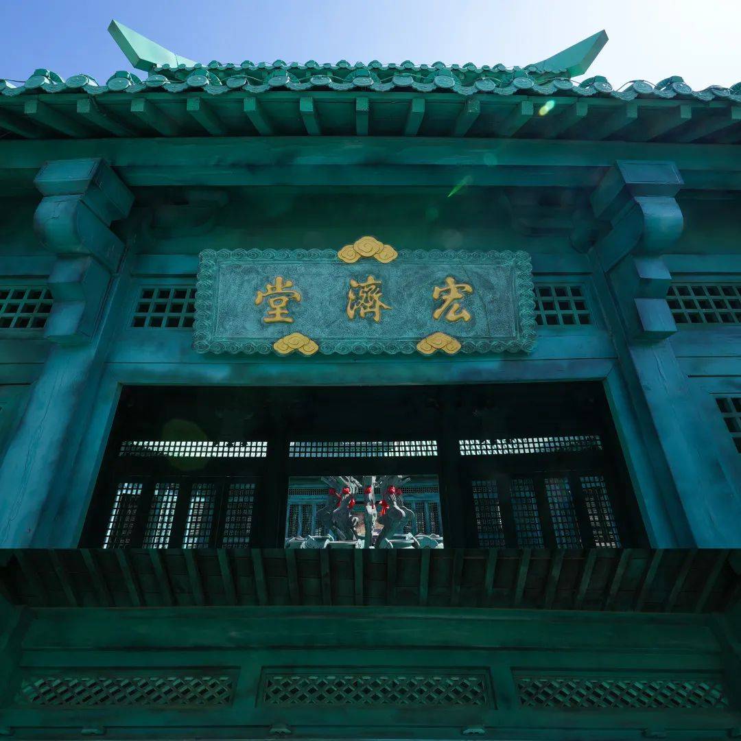 仿古建筑的整体外观为青色,入门处用鎏金字体写着“宏济堂”三个大字。建筑内部有一汪清澈的水池,中央则摆放着由九条龙、九座鼎组成的落地雕塑。