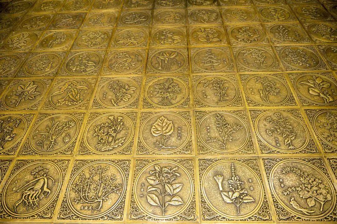 走进博物馆,脚踩的是一公分厚的铜砖,上面雕刻的是中草药的图案,也叫百草图。抬头向上看,序厅天花板为纯铜打造的百兽图。