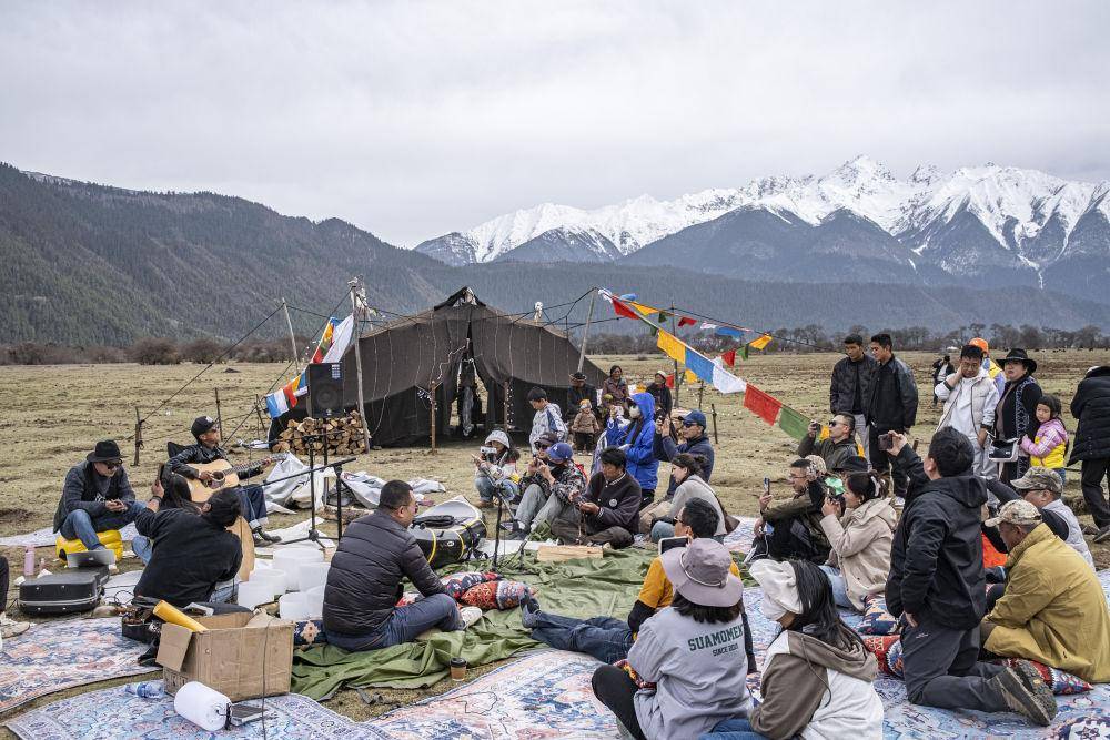 4月15日,在“巴松措漂流露营大会”现场,游客在观看文艺表演。新华社记者 曹槟 摄