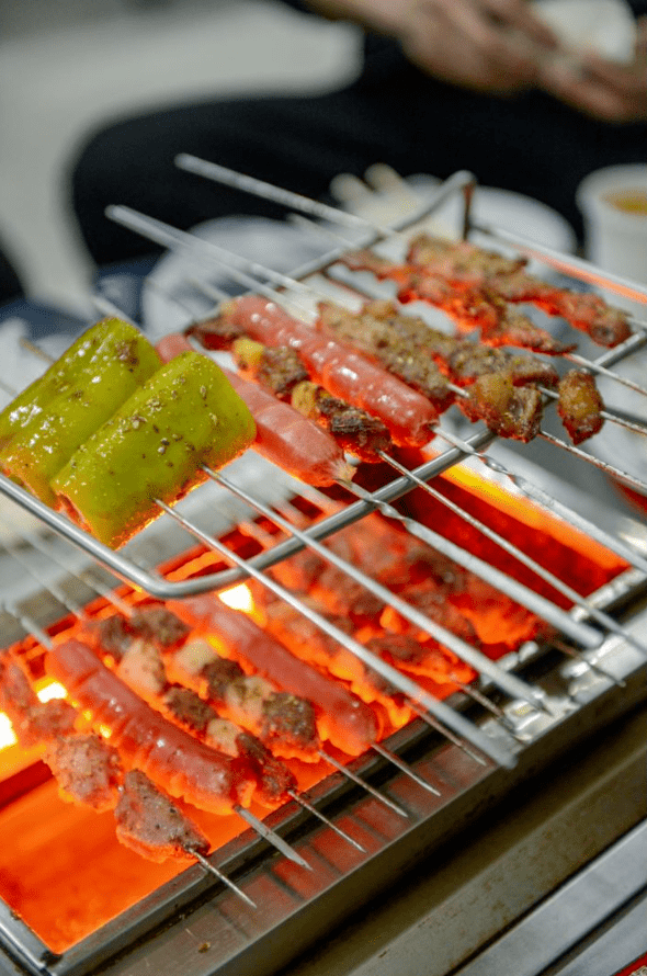 淄博烧烤当然不能错过,小饼卷起烤得直冒油的肉串,撒上花生盐和辣椒,放两棵小青葱,一口咬下,唇齿之间皆是满足。