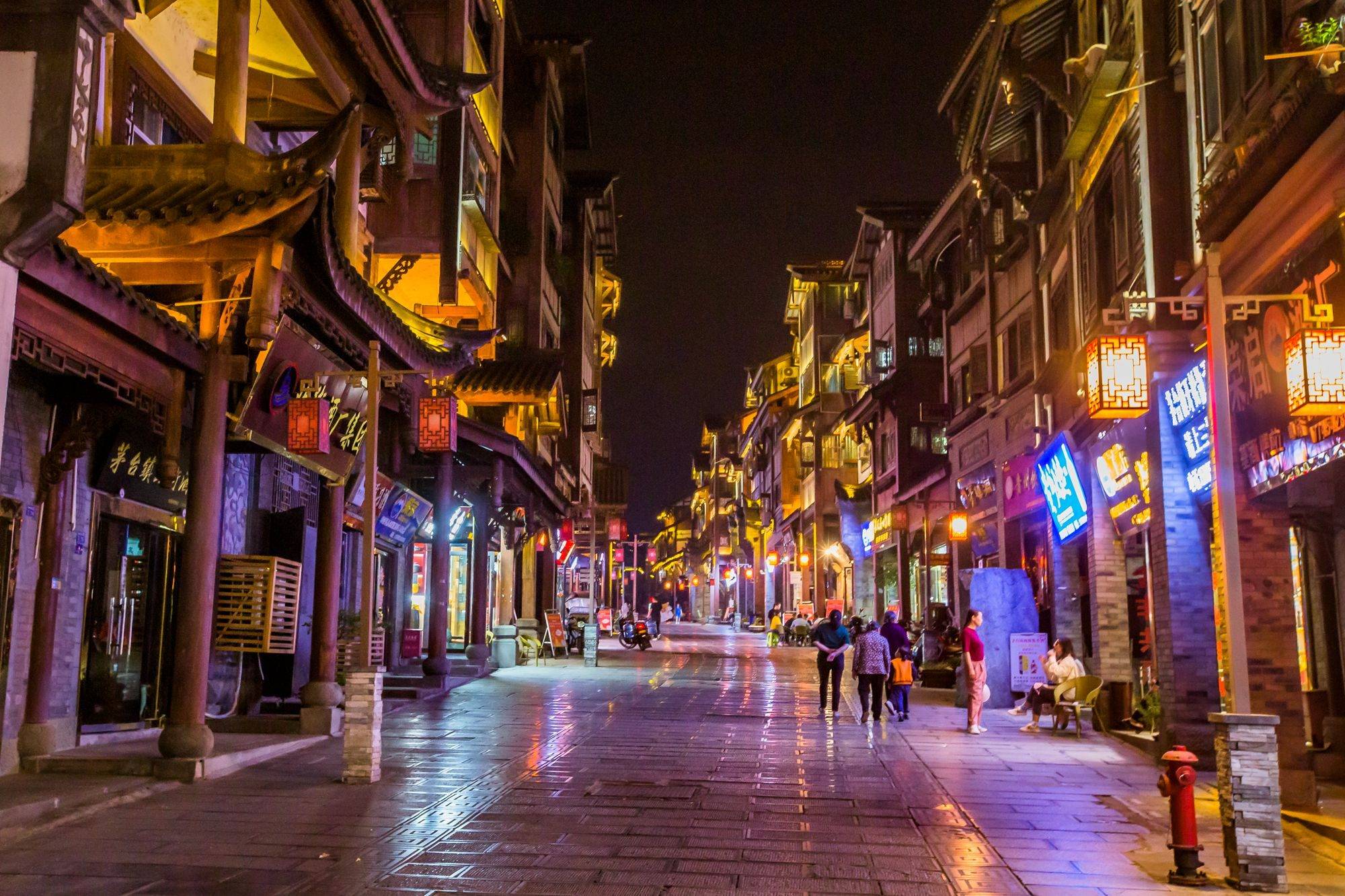 青瓦顶的仿古建筑被温暖的灯光笼罩,雕花的门窗、飞起的檐角,还有精致的宫灯将古街渲染得如电影中定格的镜头。