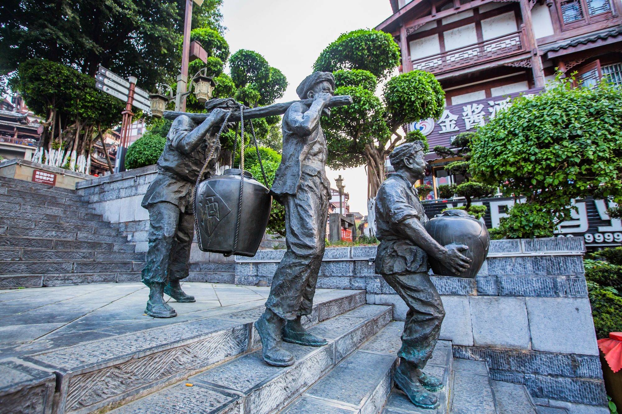 走在黛瓦青砖的古街上,处处可见的雕塑小品再现着当时茅台镇酒业的兴旺发达,再现着古镇的繁华热闹。