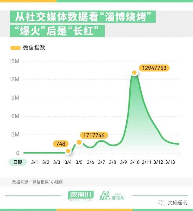 从数据上看,截至3月16日,“淄博烧烤”微信指数已经连续12天轻松过10万量级,其中有10天过100万。显然,此次淄博烧烤的出圈,绝非实昙花一现的网红产物,而是走向长红的城市文化IP。