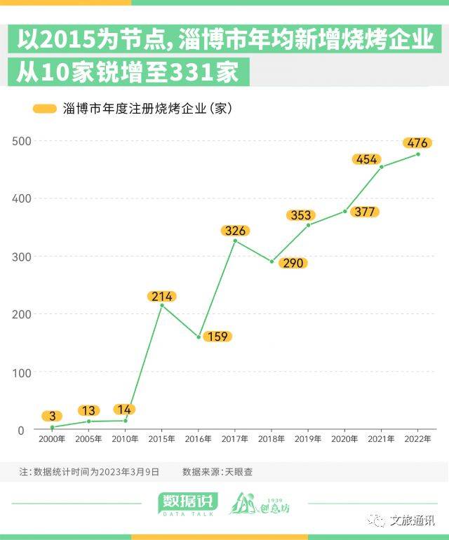 淄博烧烤真正在市场上打出名号,从2015年就开始了。据数据显示,2000-2014年15年间,淄博市年均新增注册烧烤企业仅10家,每年新增最高不超过20家。以2015年为节点,相对低迷的烧烤市场有了大转变,一举突破百家大关,新增214家烧烤企业;此后,淄博市烧烤企业注册量整体保持上升趋势,2015-2022年间,年均新增烧烤企业超过331家,2018-2022年呈逐年递增态势,其中,2021年新增454家,2022年新增476家烧烤企业。