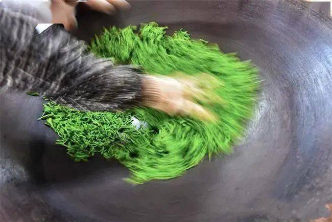 炒茶工们将茶青反复旋转抖炒