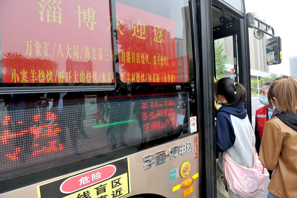 2023年4月14日,山东淄博,外地大学生乘坐烧烤公交专线。 视觉中国 图