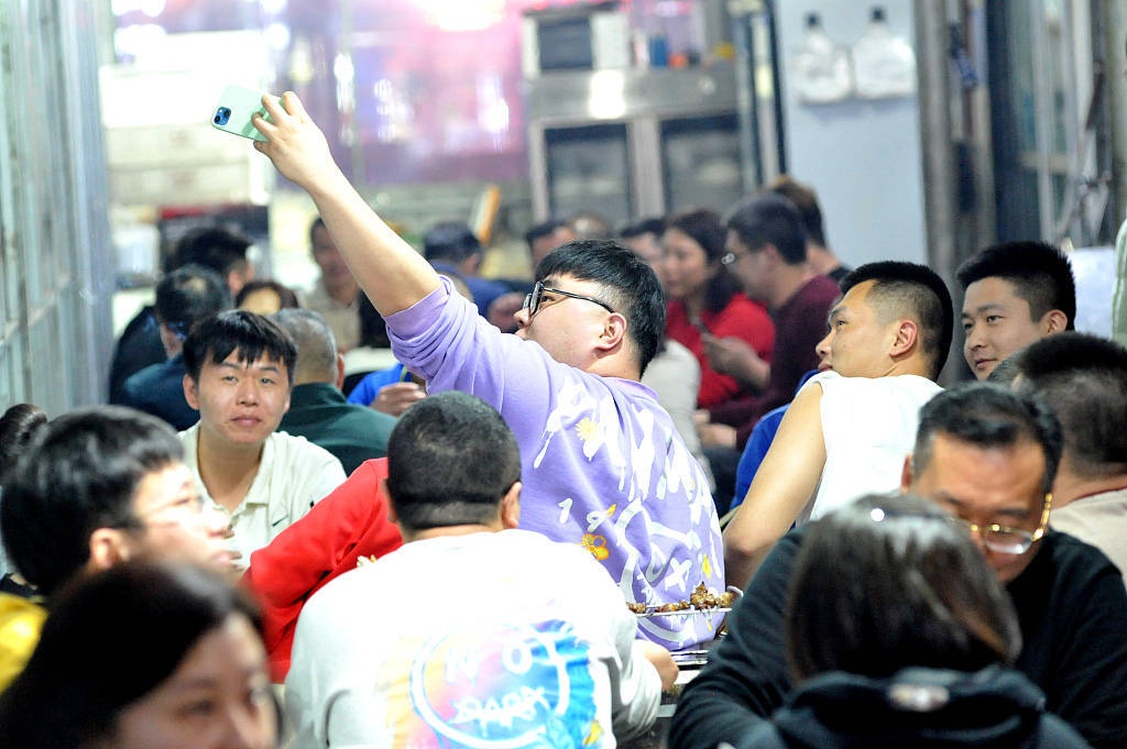 2023年3月21日,山东淄博,来自外地的大学生在吃烧烤时和同学自拍。视觉中国 图