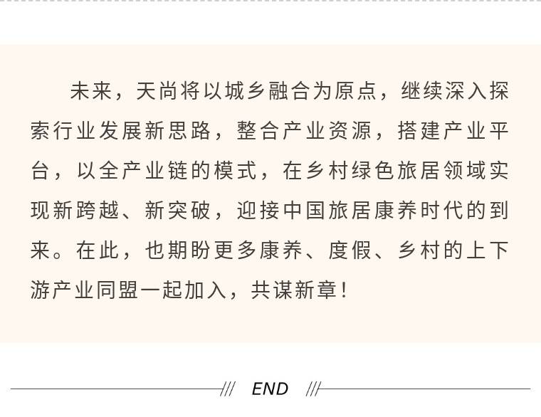 多年来,天尚控股集团一直致力于“乡村共同体”的研究和实践,秉持“以乡村发展为初心,以产业集聚为抓手,以流量导入为保障,以乡村环境建设与后期业态经营相融合为原则”的发展理念,在超千个乡村项目实践的基础上,努力营造绿色、可持续、循环的自然环境和生活空间,打造一系列人与自然、人与人、城与乡和谐共生的乡村美好生活体验中心,为新时代康养生活及城乡共融深度赋能。