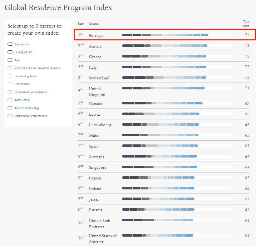葡萄牙黄金签证项目凭借着投资门槛低、居住要求低、申请要求低、身份含金量高等优势,在Henley & Partners发布的《2023全球居留计划指数》排行榜中力压英美澳,蝉联“全球最佳居留计划”。