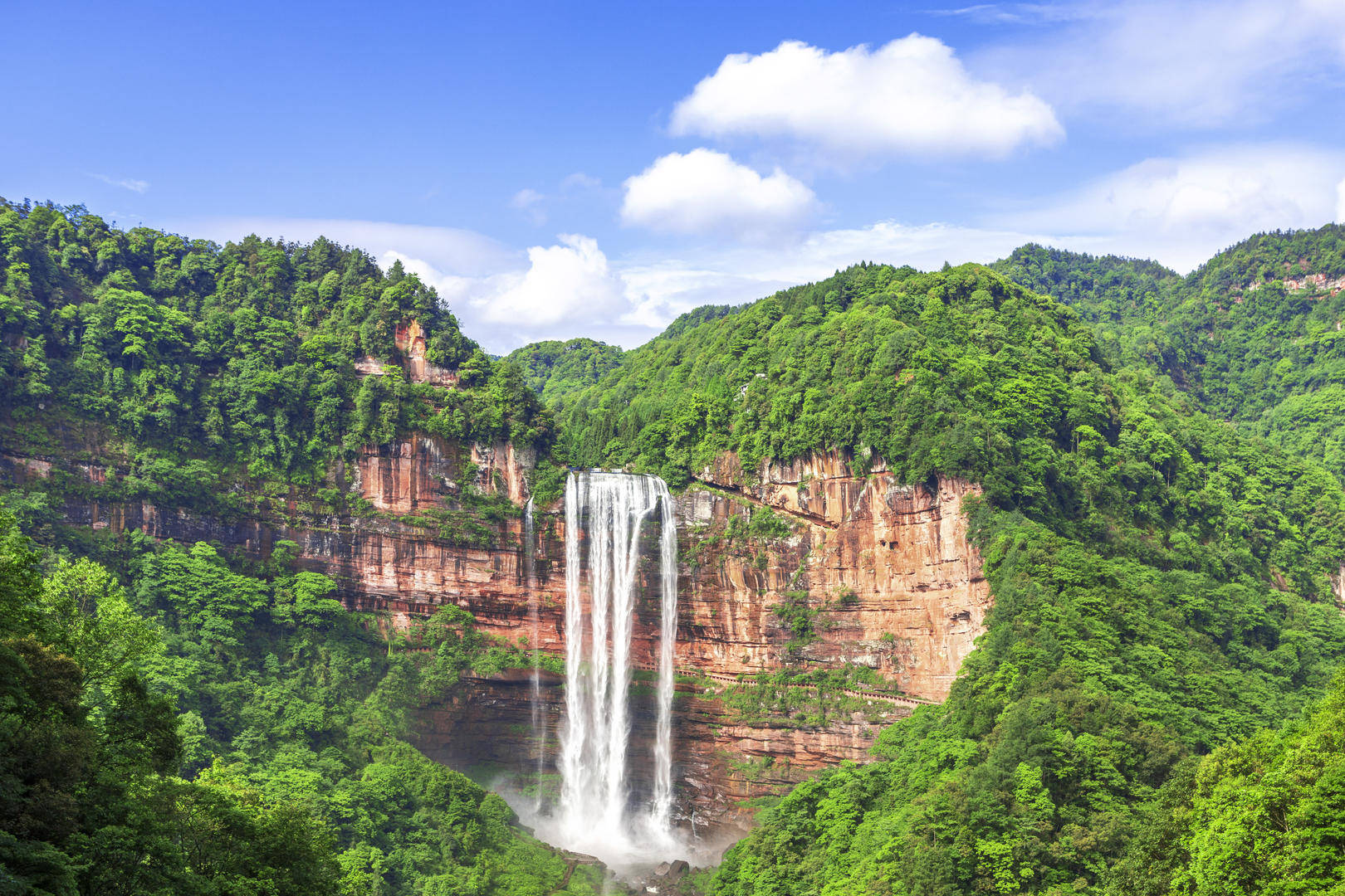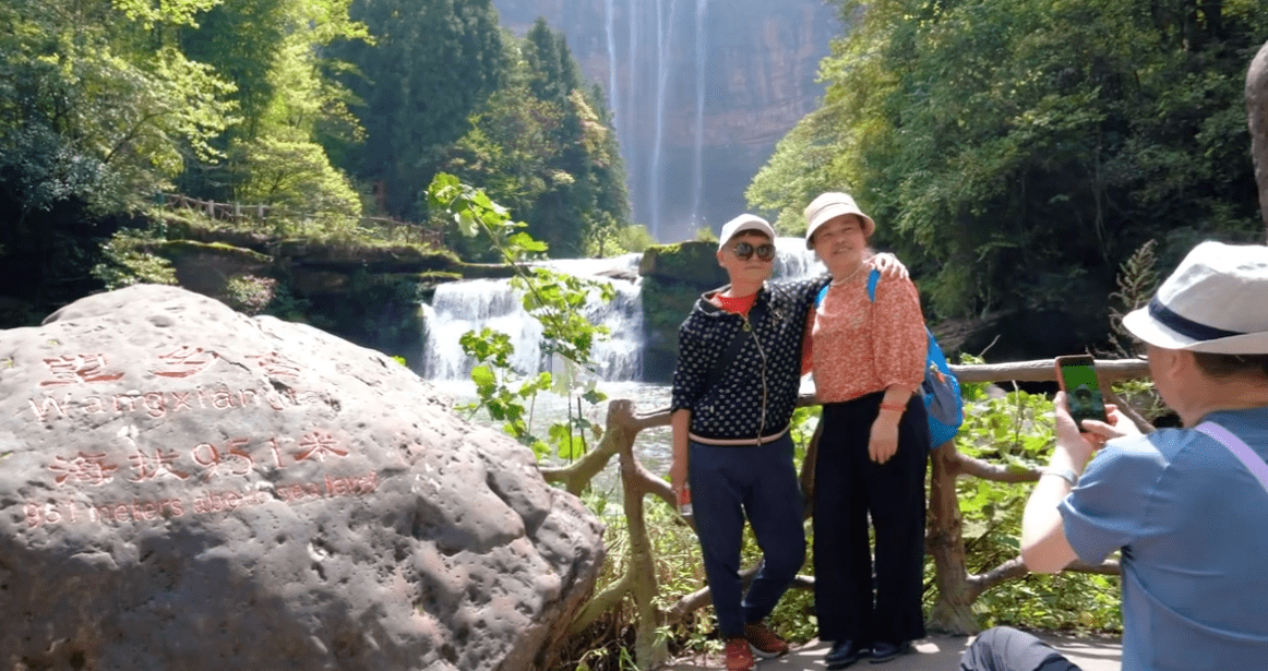不到望乡台,不来四面山。说说笑笑间,旅行团来到了四面山景区最核心的景点——望乡台,瀑布的磅礴气势瞬间吸引了大家的关注,158米的“华夏第一高瀑”挟裹着丰沛的力量泼洒而下,冲击谷底迸发出龙啸般的巨响。只见大家默契地拿出手机,对着瀑布,要么和亲朋好友合拍,要么单纯拍风景,生怕下一秒这雄伟的瀑布就会消失不见了似的。