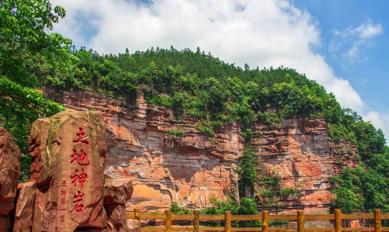 随后,旅行团又来到了土地岩景区,首先映入眼帘的是刀斩斧劈般的巨大岩壁,这就是四面山丹霞地貌最具代表性的土地岩天然壁画。这个天然壁画是大自然留下的抽象派艺术杰作,宽376米、高127米,远观犹如半壁丹岩倒映在湖中所成景象,岩壁之上更是能看见栩栩如生的各类飞禽走兽、人物事件,如:杨贵妃、癞蛤蟆、阿凡提、海啸等,大家都驻足解读、细心品味,尤其是小朋友们纷纷对壁画产生了浓厚的兴趣,拉着解说小姐姐,一起耐心地寻找着藏在壁画当中的小惊喜。