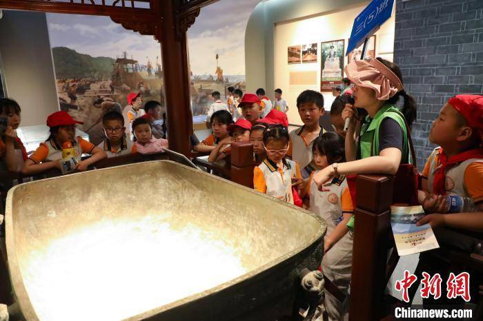 在肥西县铭传乡刘铭传纪念馆,研学游学子正在观赏青铜器虢季子白盘(复制品)。 陈家乐 摄