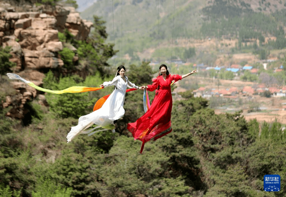 4月16日,游客在沂南县红石寨景区体验高空威亚项目。