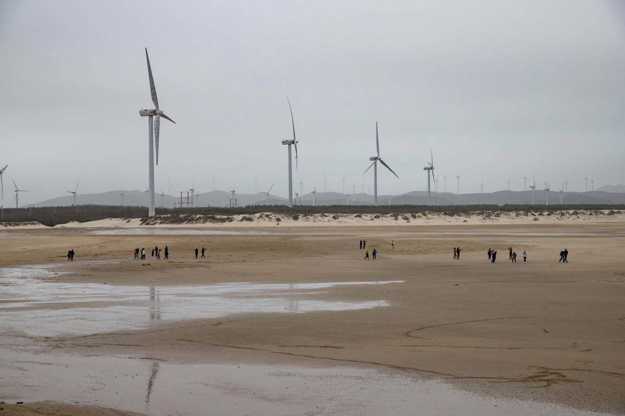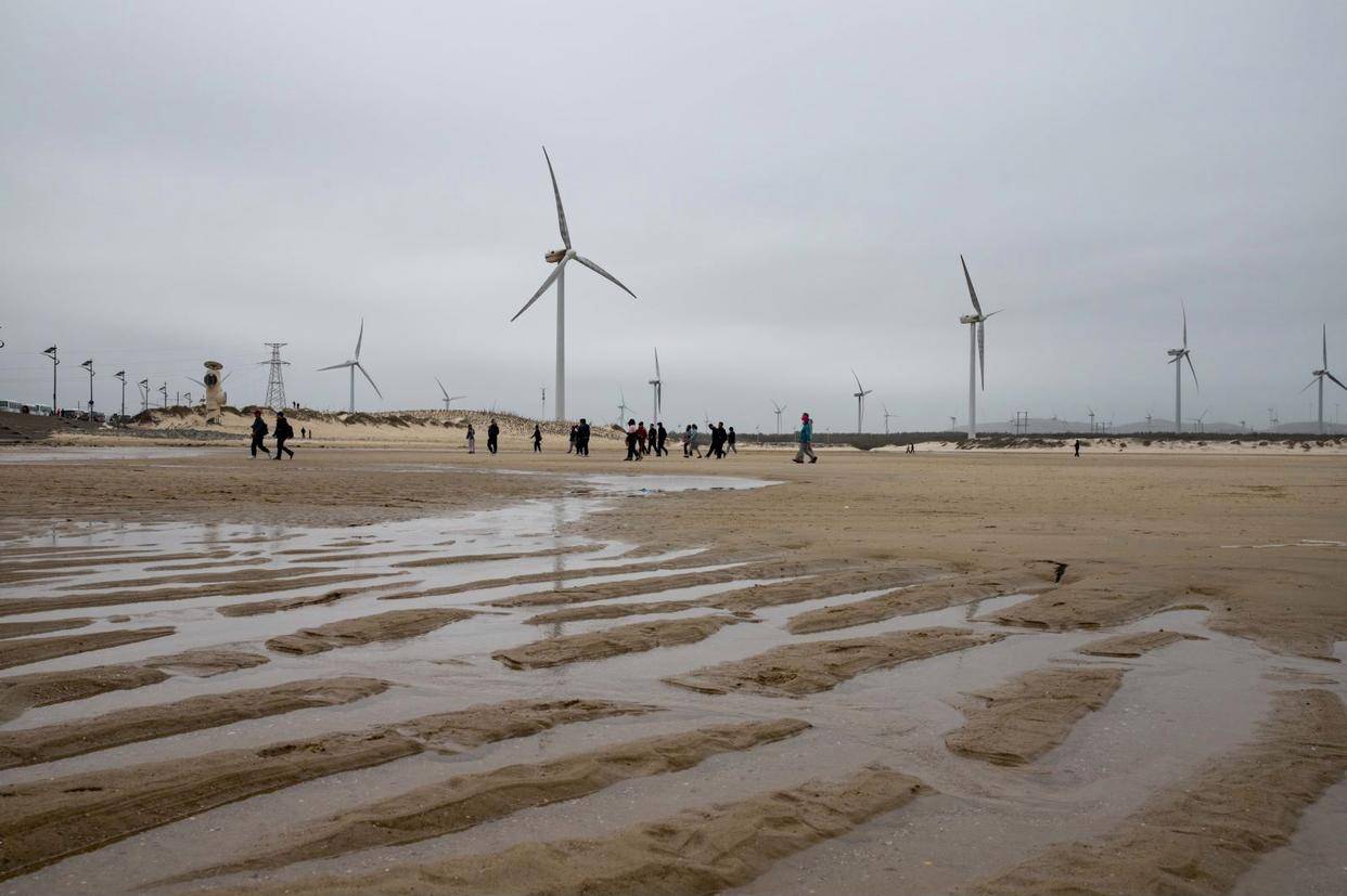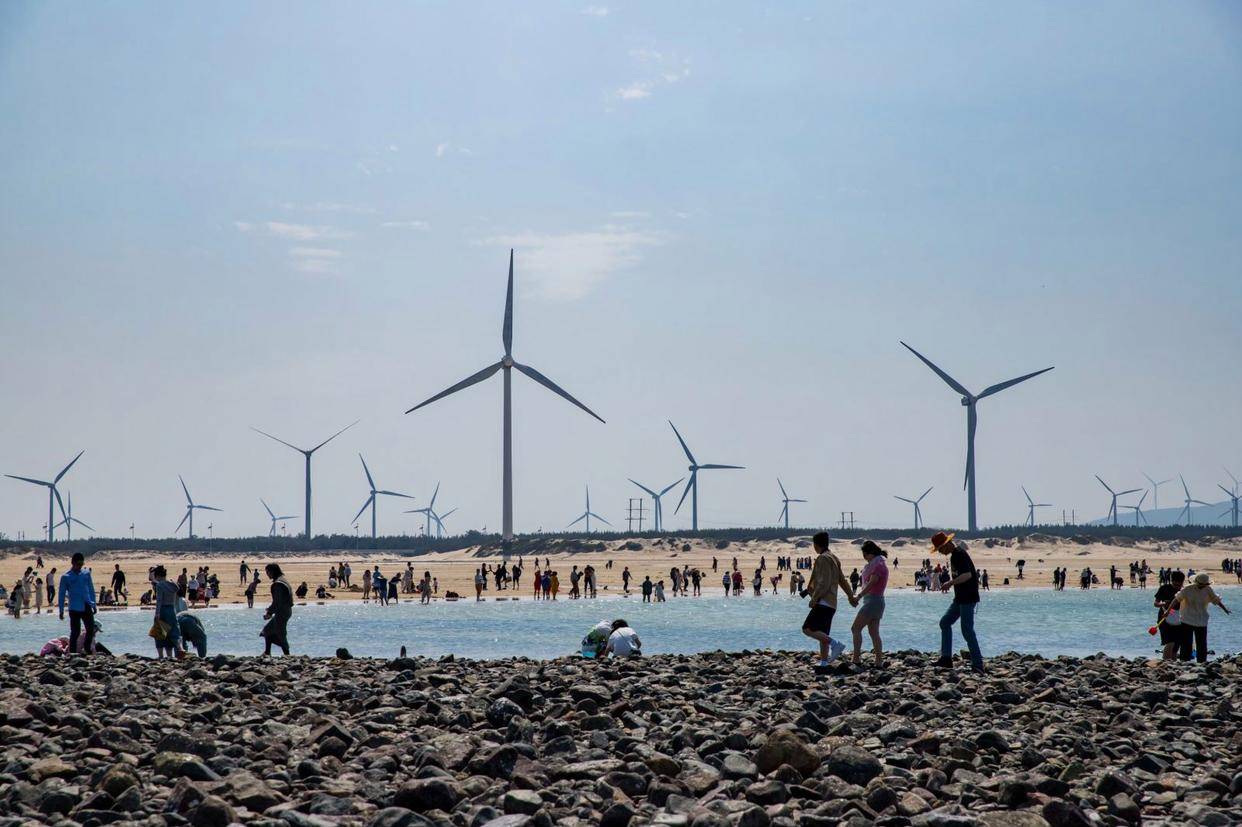 长江澳也是一样,好在它自带光芒,几百架高大的风车成排耸立在海边沙滩上,威武壮观,吸引众多游客驻足观看。虽然天气不好,依然有很多游客踏着细软的沙滩走近海边,吹海风、听海浪,到烂石滩扒螃蟹,感受大海带来的广阔与慷慨。