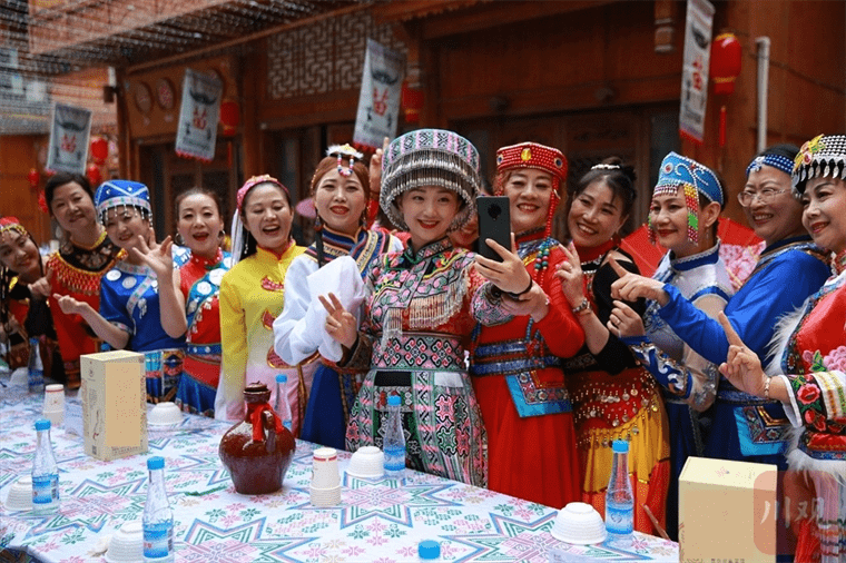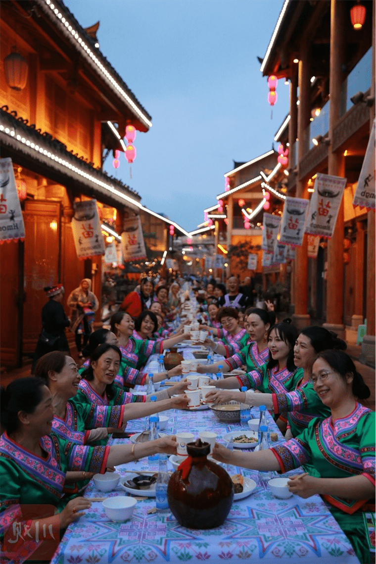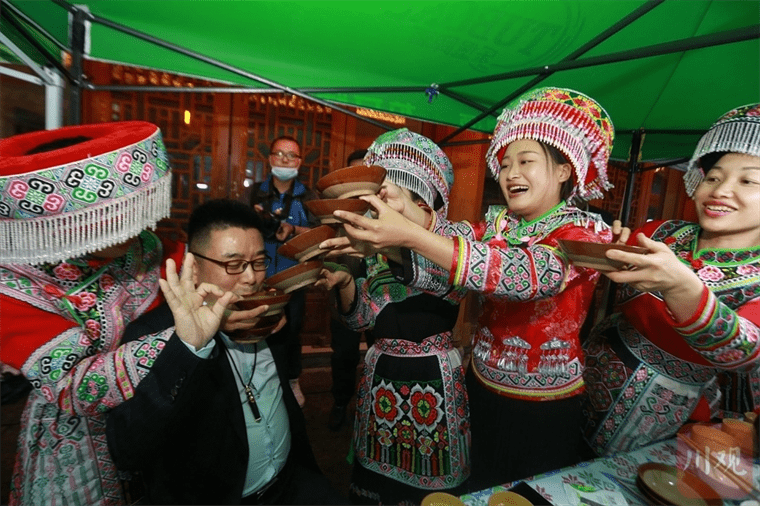 游客体验苗家长桌宴的“高山流水” (图据川观新闻)