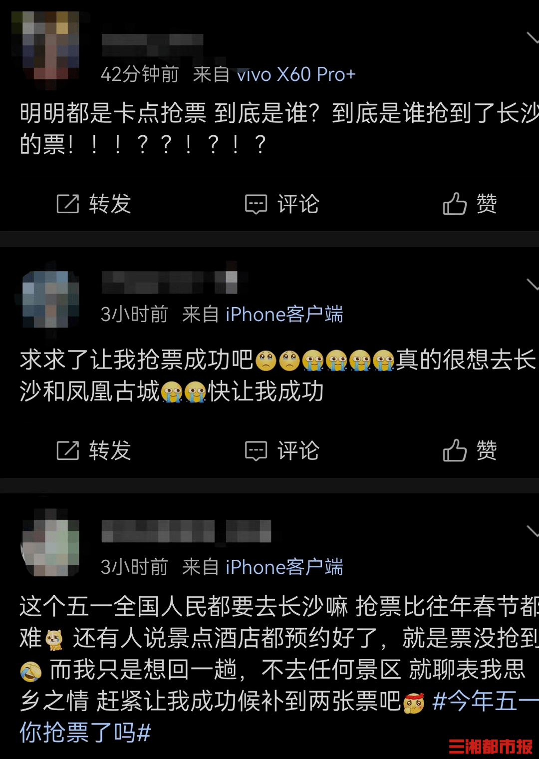 有的网友为了抢来长沙的高铁票还特意定了闹钟,结果还是扑了个空;有的网友一口气预定了四十个车次,结果还是没买上……对此,不少网友纷纷吐槽:今年“五一”火车票比春运还难抢、“谁抢了游子的归乡票”、“五一”去长沙的火车票抢出生死时速……