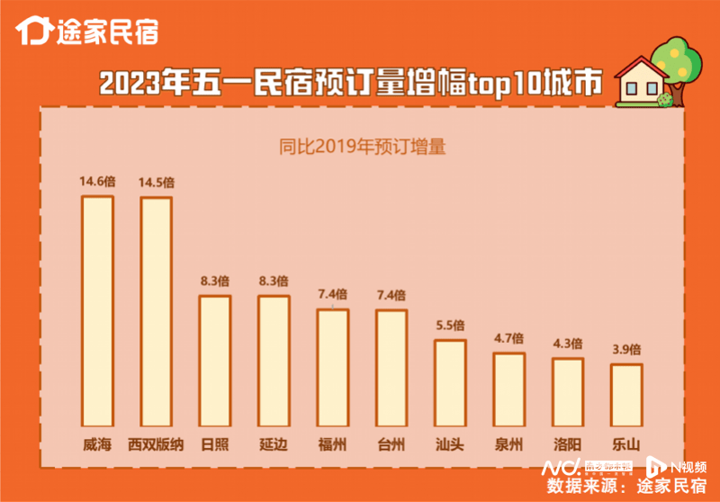 与李玉有着一样想法的人还不少,今年五一民宿预订出现了错峰“躲热点”的趋势,一些原本小众的海滨城市集体“爆单”。途家民宿数据显示,有10个城市五一期间民宿提前预订量比疫情前增4倍,其中8个都在海边:威海民宿提前预订量暴增14.6倍,排名第一,日照、福州、台州、汕头等紧随其后。