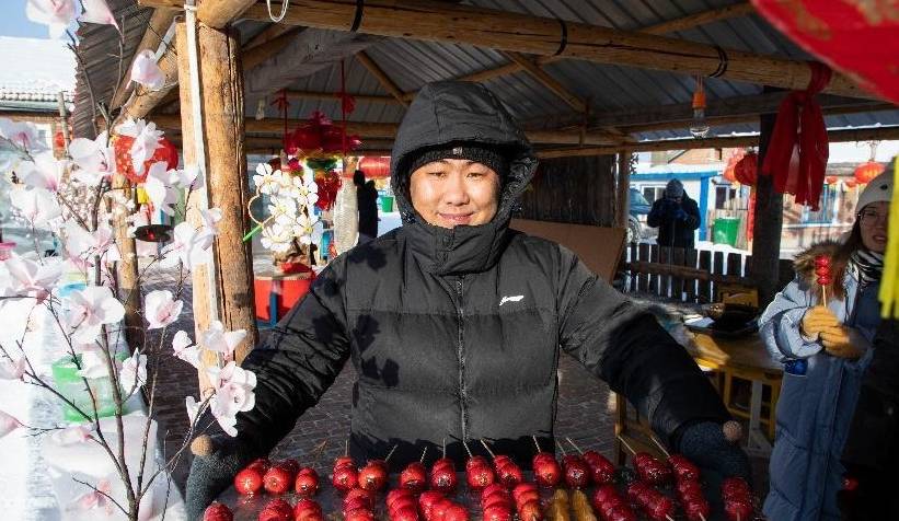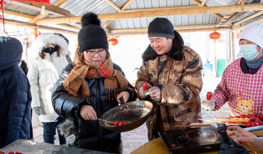 “正宗的东北大餐来了,今天的菜品有小鸡炖蘑菇、猪肉炖酸菜、肉丝炒卜留克等共8道菜,主食有自己家磨的面粉蒸的花卷和纯手工做的粘豆包,大家可劲儿造啊!”在冷极村程家大院,男主人程善忠热情地招呼着客人。