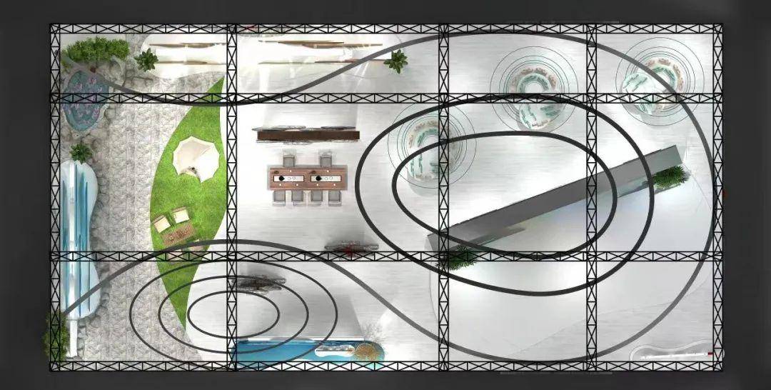咸宁馆顶部造型设计宛如宝瓶,汇天地灵气,落地成泉,瓶口下方模拟温泉场景,运用虚实结合的手法展示咸宁温泉特色,图文结合的形式展示咸宁知名温泉项目。