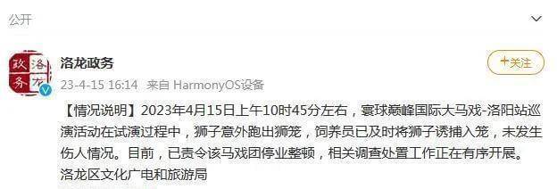 4月15日,洛阳市洛龙区文化广电和旅游局通报,4月15日上午10时45分左右,寰球巅峰国际大马戏-洛阳站巡演活动在试演过程中,狮子意外跑出狮笼,饲养员已及时将狮子诱捕入笼,未发生伤人情况。目前,已责令该马戏团停业整顿,相关调查处置工作正在有序开展。