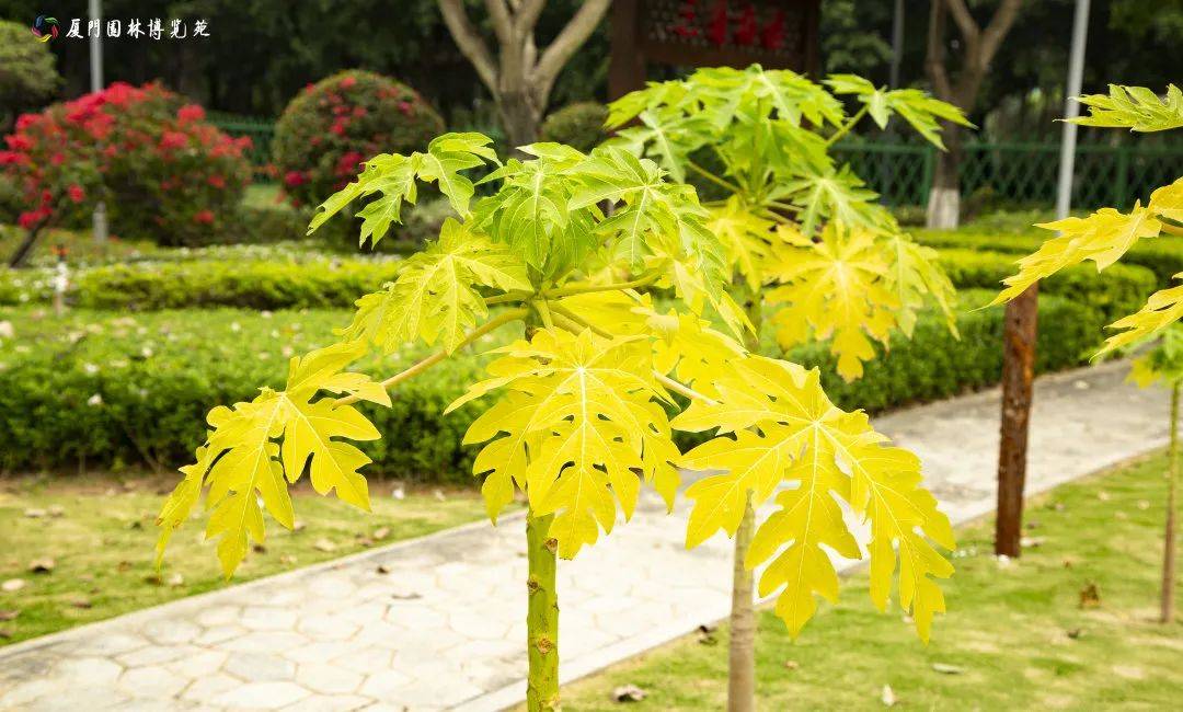 D岛三角梅园旁绿地,草地上有参加研学活动的学生们种植的木瓜。(林斌享 摄)