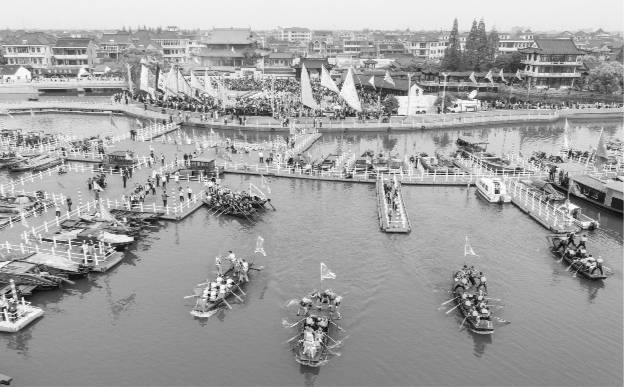 图为4月18日,传统踏白船表演在王江泾镇莲泗荡的网船会现场举行(无人机照片)。