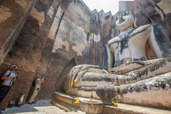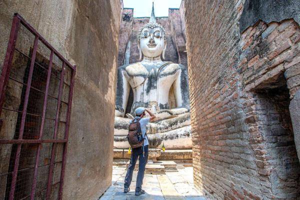↑4月16日,游客在泰国素可泰古城遗址拍照。新华社记者 王腾 摄