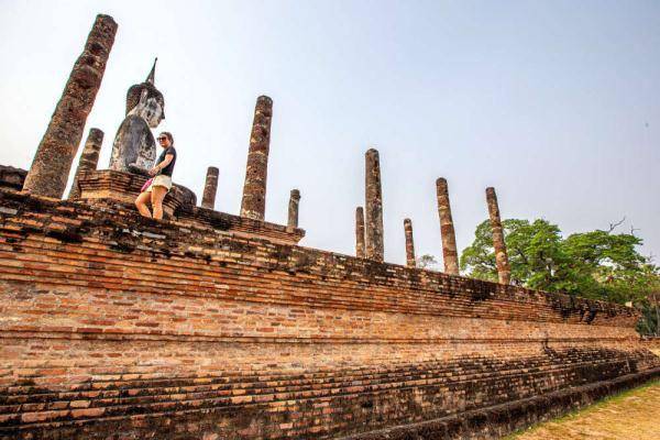 ↑4月17日,游客在泰国素可泰古城遗址拍照。新华社记者 王腾 摄
