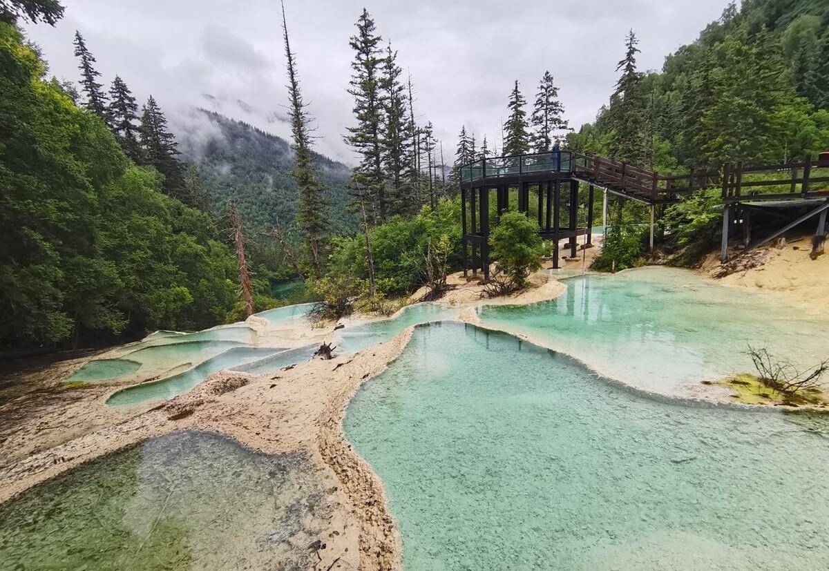 8.珍珠滩:珍珠滩是九寨沟中最有名的石灰华滩之一,这里的石灰华地形非常奇特,形成了各种各样的图案和形状,非常壮观。在阳光的照耀下,石灰华滩上的水滴闪烁着光芒,像是散落的珍珠一样,非常美丽。