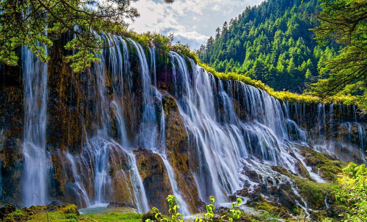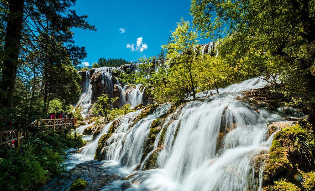 4.诺日朗瀑布:诺日朗瀑布是九寨沟最大的瀑布之一,高达20米,水流如练,落差很大。瀑布周围的植被非常茂密,瀑布后面的山峰也非常壮丽,是摄影爱好者的最爱。