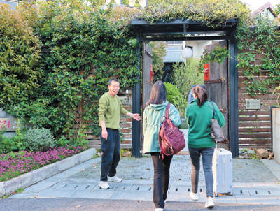 江苏无锡市“山居壹聚”民宿业主毕建林(左)迎接游客上门。陈 斌摄