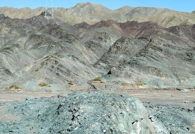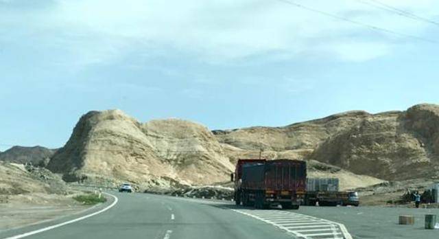 干沟里的山呈丘陵状态,山体不高、连绵不绝,由于没有植被覆盖,因此呈现出来的颜色都是山石的本色,山体多为岩层,山石多滑落堆积,山石很多都如斧子劈,刀削般地棱角分明;山间行驶,需要注意力高度集中,路窄弯多,货运车大车交错让危险系数增高不少,不免提醒吊胆。一路需要不断翻山、同时道路两边不是山体就是沟壑,很多离奇交通事故都发生在此地段,一路40码限速,压抑感倍增。