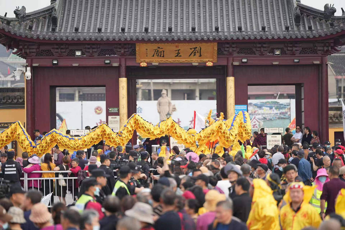 4月18日,嘉兴秀洲区,中国江南网船会开幕日,刘王庙外正在表演传统舞龙,游客们摩肩接踵,现场热闹非凡。