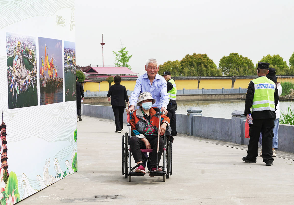 4月18日,嘉兴秀洲区,中国江南网船会开幕日,老爷爷正在推着同伴前来参加“网船会”。