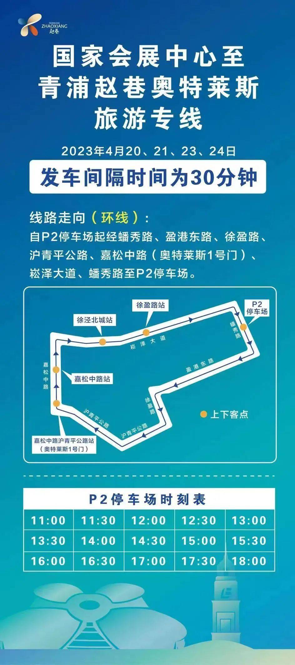 2023年上海车展于4月18-27日在国家会展中心举行,为更好地助推区域商业经济发展,青浦区拟于2023年4月20、21、23、24日,11:00至18:00,免费开设自国家会展中心至青浦赵巷奥特莱斯的旅游专线1条,发车间隔时间为30分钟。具体线路如下: